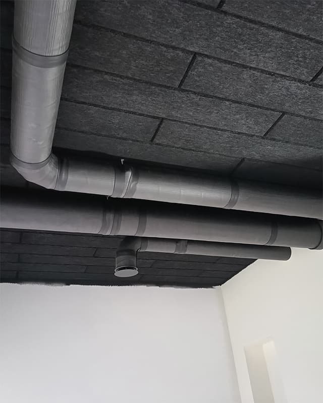 Kadangi objekto lubos buvo nudažytos juoda spalva, buvo priimtas sprendimas ortakius aptraukti juodos spalvos izoliacine medžiaga. Taip pat sumontavome juodos spalvos, oro padavimo ir ištraukimo difuzorius.