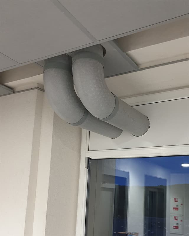 Komercinės paskirties patalpose buvo sumontuota atvira vėdinimo sistema su standžiais, skardiniais ortakiais.