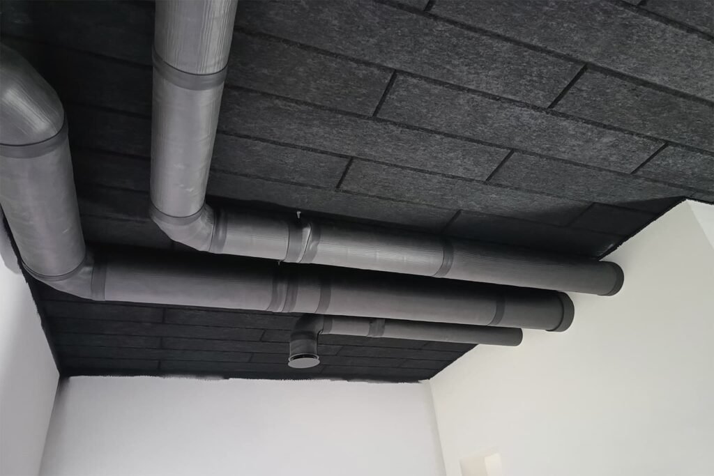 Indviduliame name buvo montuojama rekuperacinė sistema, standžiais skardiniais ortakiais. Pagal pirminį projektą kai kuriuose kambariuose ortakiai turėjo būti montuojami vienas po kitu, dėl ko mažėtų lubų aukštis. Pakoregavus projektą, visus perkryžiavimus padarėme katilinės patalpoje, išvengiant brangesnio sprendimo, montuoti ortakių kryžmes kambariuose.
