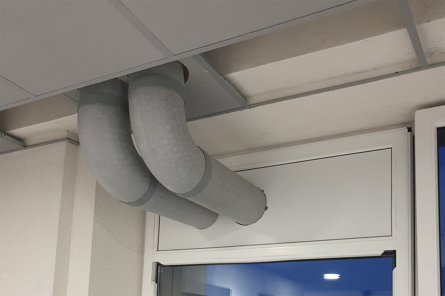 Biurų pastate, septintajame aukšte, klientas norėjo įsirengti vėdinimo sistemą. Biure nebuvo sienų, kuriuose galima būtų įrengti oro paėmimo ir išmetimo angas. Dėl didelio aukščio buvo sudėtingas lauko grotelių montavimas. Problemas išsprendėme išimdami viršutinį lango stiklą ir jį pakeisdami plastikine plokšte. Joje iškarto buvo sumontuotos dvigubos oro paėmimo – išmetimo grotelės.