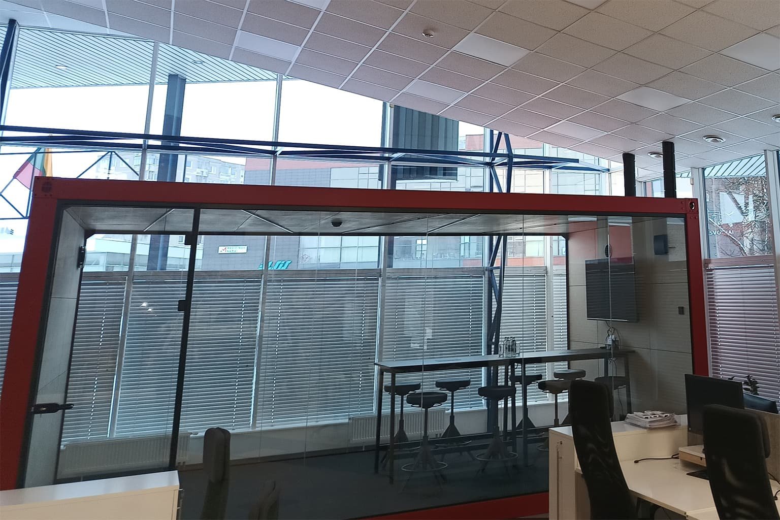 Komercinėse patalpose klientas įsirengė pasitarimų kambarį jūriniame konteineryje. Bendroje erdvėje buvo sumontuotas lubinis oro kondicionierius. Kad nereikėtų dar vieno kondicionieriaus, patalpos vėsinimui buvo nuspręsta atvesti izoliuotą ortakį iki pasitarimų patalpos, nuo lubinio kondicionieriaus. Oro srautui reguliuoti sumontavome automatinę sklendę. Šviežio oro tiekimui pasirinkome „silent” serijos kanalinį ventiliatorių, taip sumažindami triukšmo lygį iki minimumo.